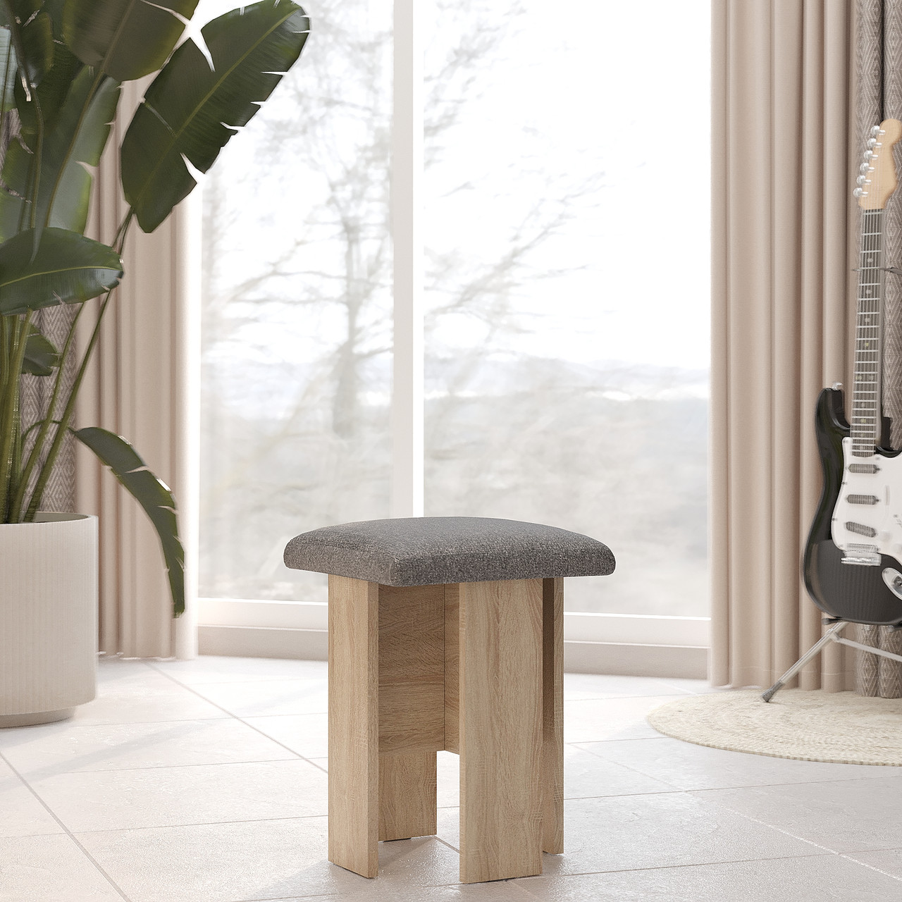 Табурет має м'яке наповнення, а оббивка виконана з тканині, яка легко піддається очищенню у разі забруднення.