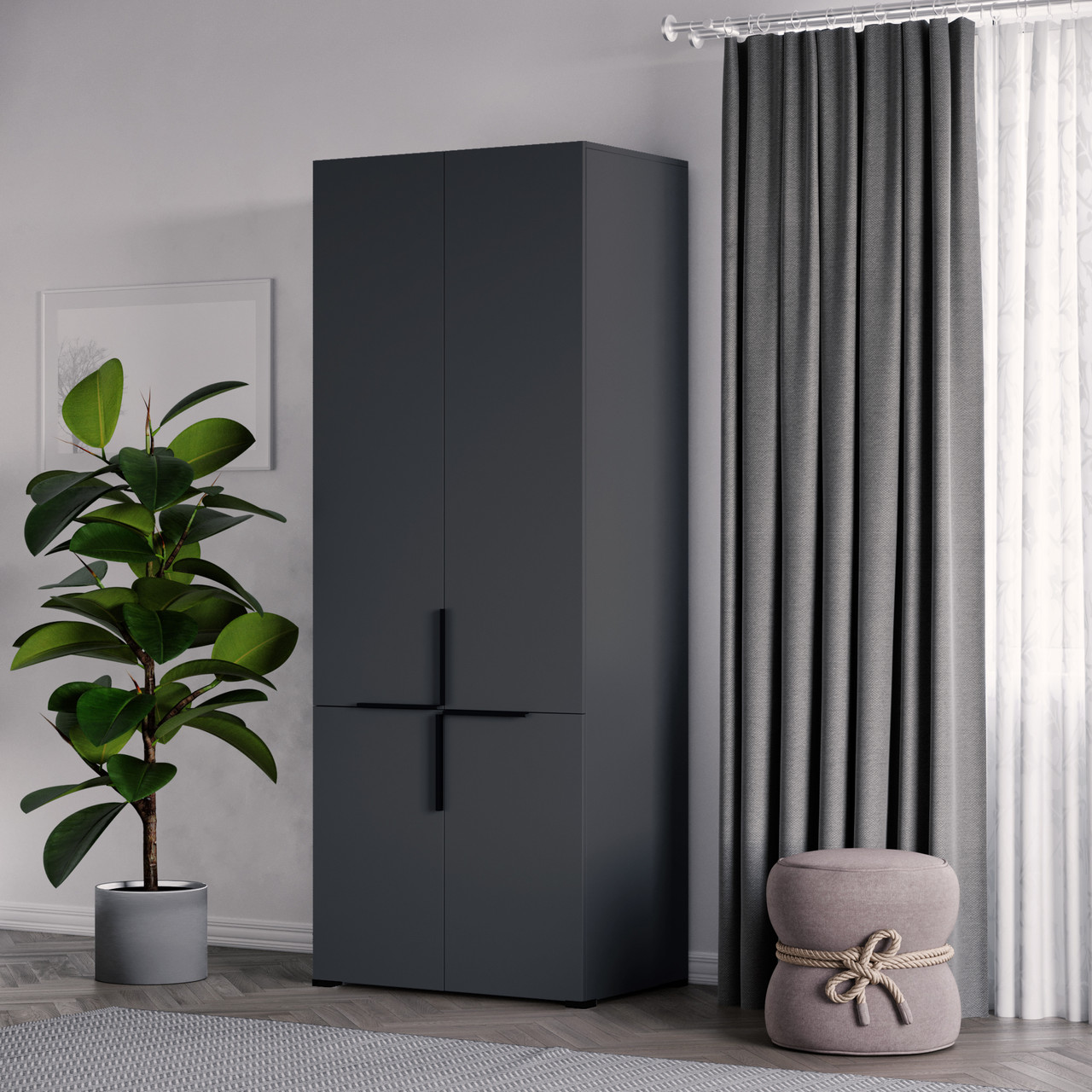 Шафа має 3 місткі полиці та місце для зберигання одягу вертикально, закривається чотирма дверцятами. Дверцята оснащені фурнітурою з доводчиками, що забезпечує плавне закривання дверей та комфортне використання.