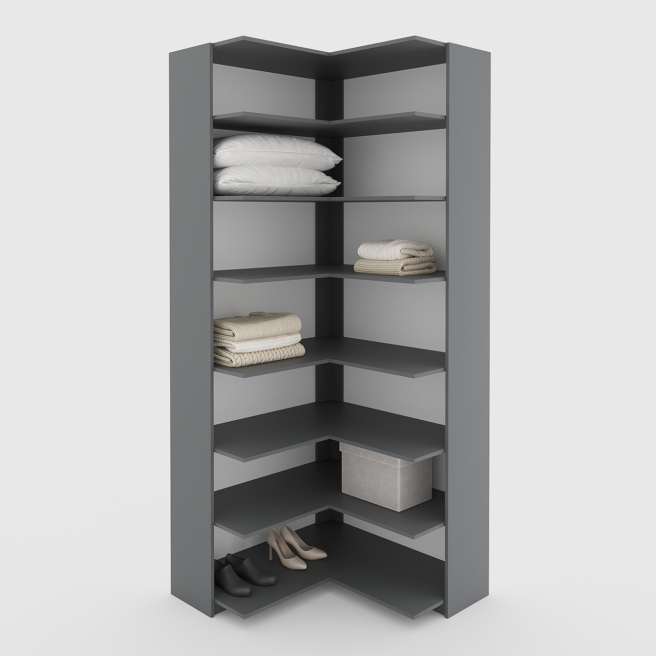 Корпус виготовлено з ламінованого ДСП 16 мм. Це модульна система для зберігання одягу, взуття та аксесуарів. Модулі можна підбирати і розташовувати так, щоб максимально використовувати доступний простір, створюючи функціональну гардеробну.