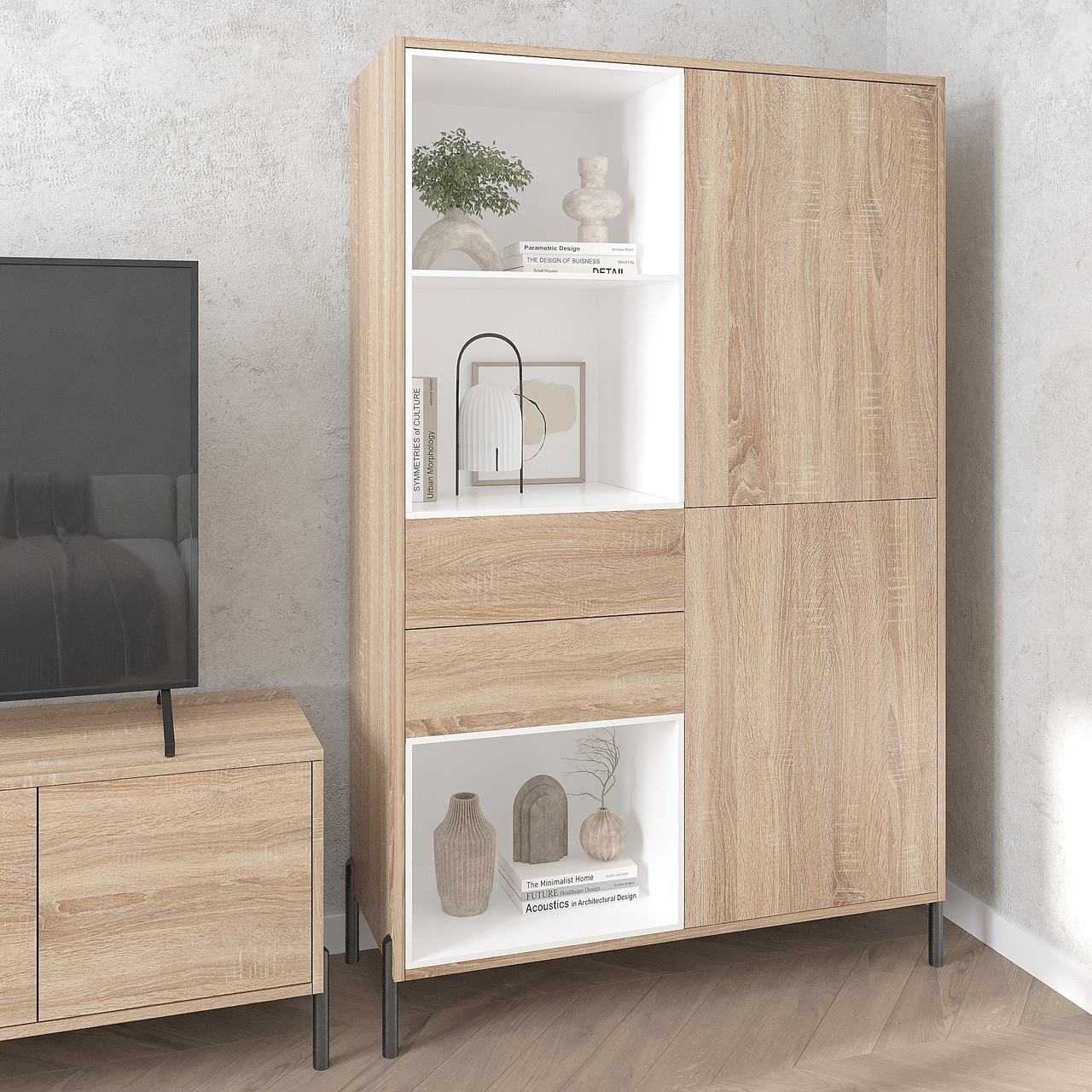 Шафа Норді виготовлена з якісного ламінованого ДСП товщиною 16 мм, що забезпечує її міцність та надійність у щоденному користуванні. Завдяки лаконічному дизайну з відкритими нішами модель гармонійно поєднує функціональність і естетику. Металеві ніжки додають конструкції стійкості та легкості, візуально підкреслюючи сучасний характер меблів.