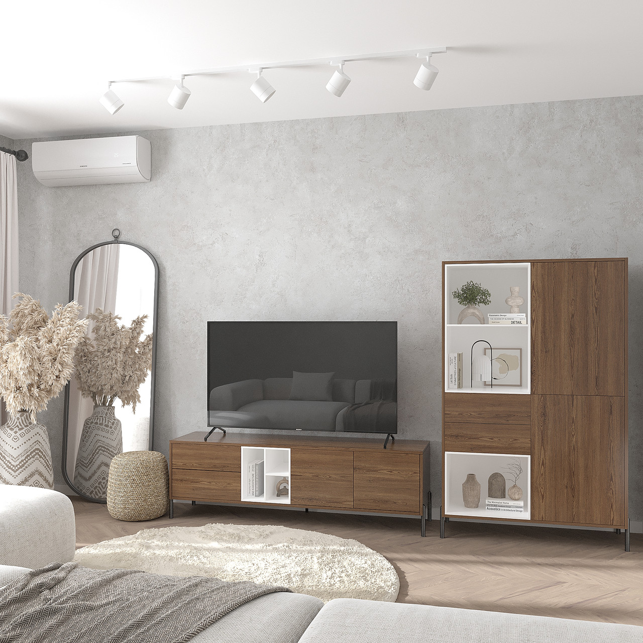 Тумба під телевізор має продуману конструкцію з відкритою секцією по центру та закритими відділеннями з боків. Це дозволяє зручно розмістити декоративні елементи або техніку, забезпечуючи порядок та охайність у кімнаті.