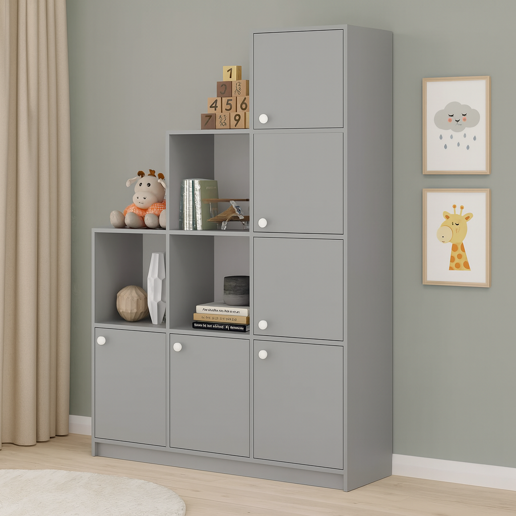 Функціональність:rong> Комбіновані секції — відкриті полиці та закриті шафки зі зручними круглими ручками — дозволяють організувати зберігання іграшок, книг та особистих речей, підтримуючи лад.